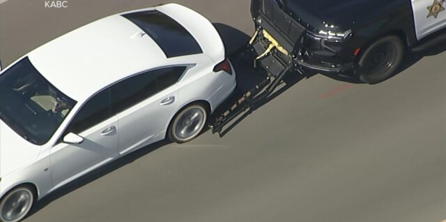 A sheriff’s vehicle deployed a grappler in an attempt to stop a vehicle being pursued on a highway. The car can be seen spinning out through multiple lanes of traffic, then crashing through a wall. Continue reading WATCH: Video shows dramatic end to police chase in Jurupa Valley, California