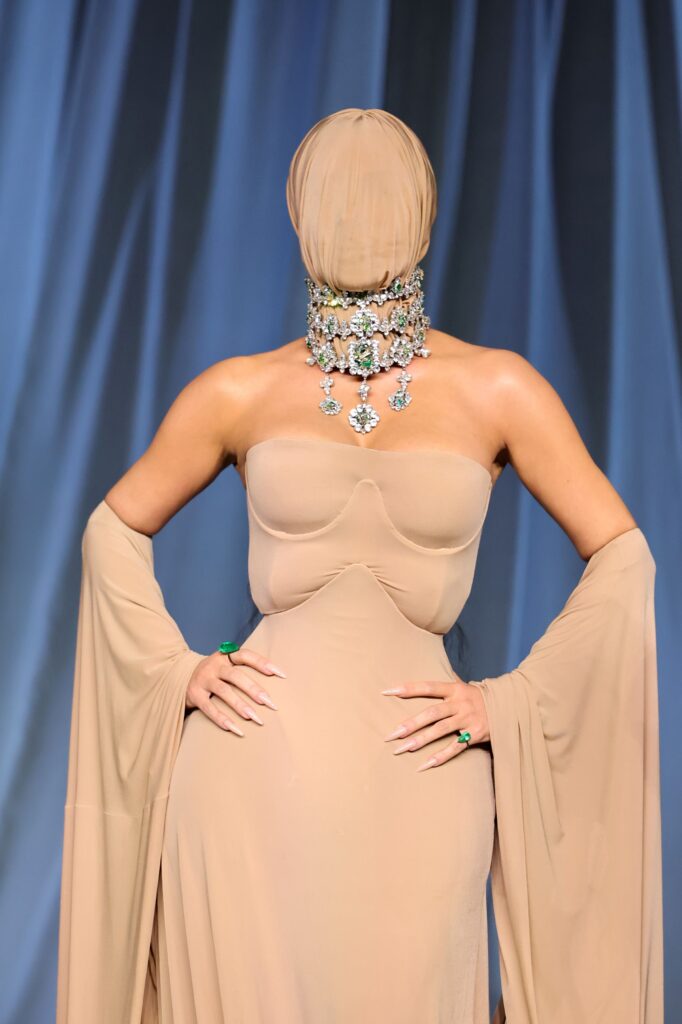Kardashian paired a nude-colored, face-obscuring mask with a strapless, corseted Maison Margiela gown. The dress featured draped sleeves that attached to the hem, making a dramatic statement on the red carpet.