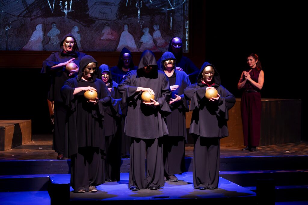 A large part of the production’s approach involves motion. Two dancers and several cloaked figures swirl about with geometric blocks, assembling formations that provide clues about the coming scenes. One of the most notorious images is Louvre curator Jacques Saunière (Stephen Sammonds), freshly murdered and lying naked on the museum’s floor in a peculiar posture. (No worries— all the crucial “parts” are covered.)